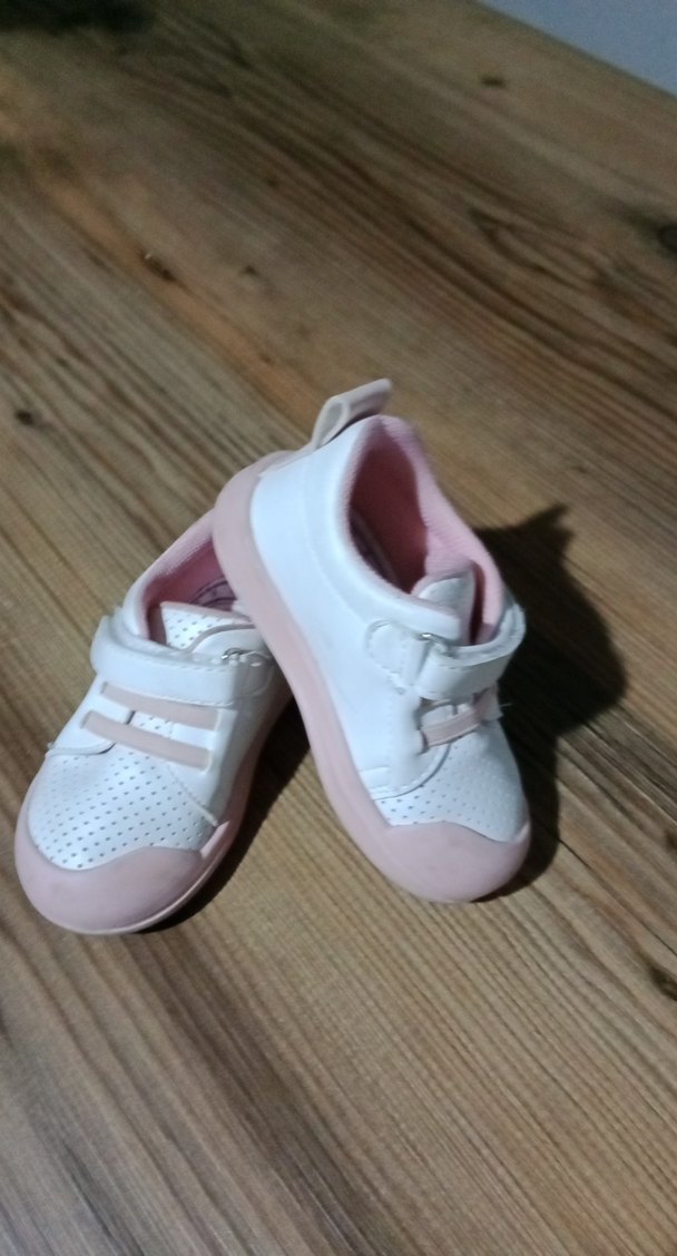 Kız çocukları için pudra ve beyaz renklerde, lastik tabanlı spor ayakkabılar. Velcro bantlı, sade ve düz yüzeyli.