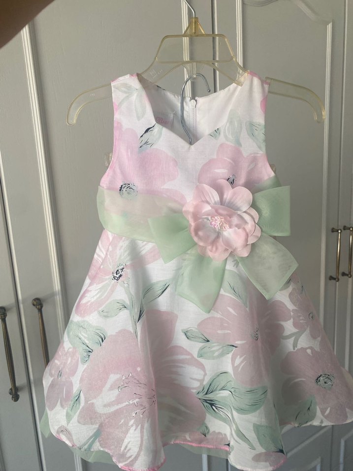 Kız çocuklar için, askısız yaka ve pastel çiçek desenli, fitted kesim kolsuz elbise. Fırfır detaylı ve belde büyük çiçekli fiyonk bulunur, yumuşak sentetik kumaştan vintage tarzda. Amerikadan hediye geldi