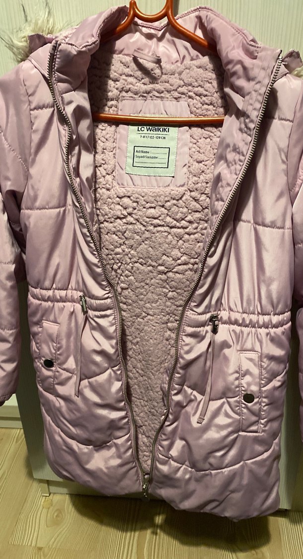 Pudra renkli, fermuarlı cepleri olan kız çocuk montu. Suni kumaştan üretilmiş, içi yumuşak astarlı ve normcore tarzına uygun.