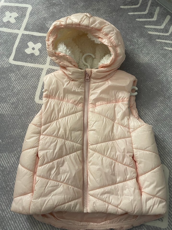 Kız çocukları için pastel pembe renkli, kapüşonlu ve kürk detaylı, kolsuz, fitted kesim yelek. Sıcak ve yumuşak astarlı, günlük kullanım için uygun. 3-4 yaş içindir