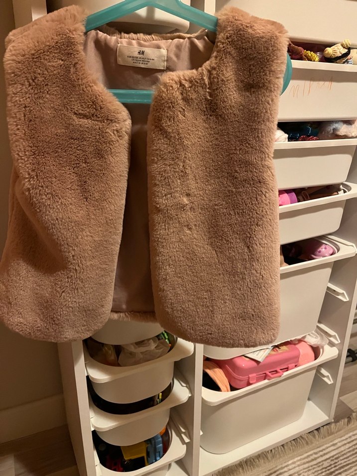 Kız çocukları için pudra, kürklü detaylı, kolsuz yelek. Fitted kesim ve yaka detayıyla pastel tonlarda, sade ve desensiz tarzda.
