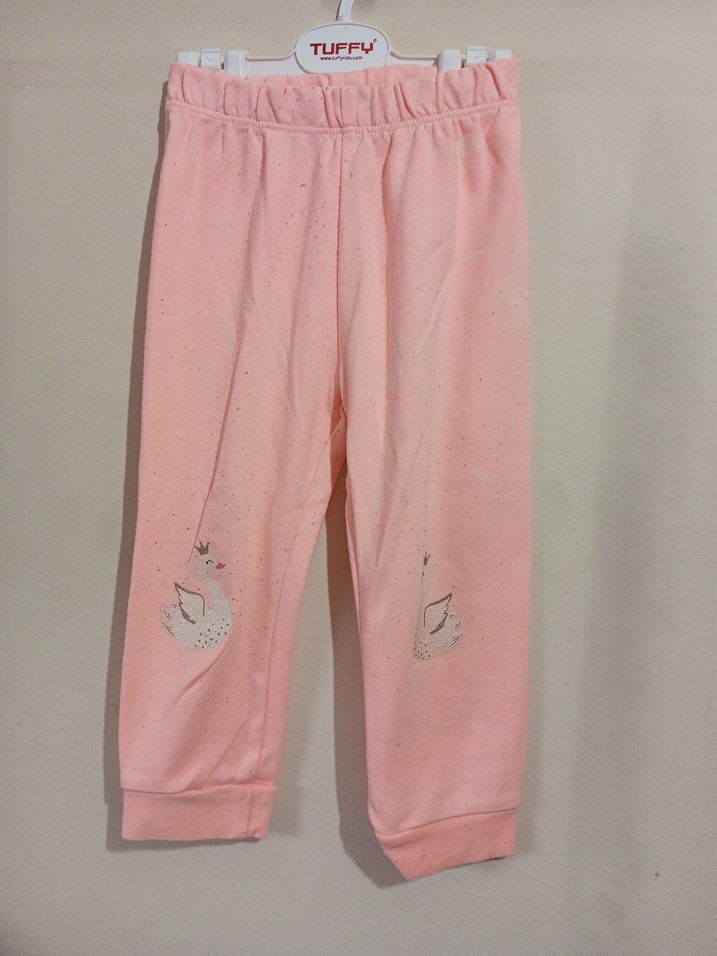 Pastel pembe renkli, dantel detaylı, bol kesim ve yumuşak pamuk kumaşlı kız çocuk taytı.