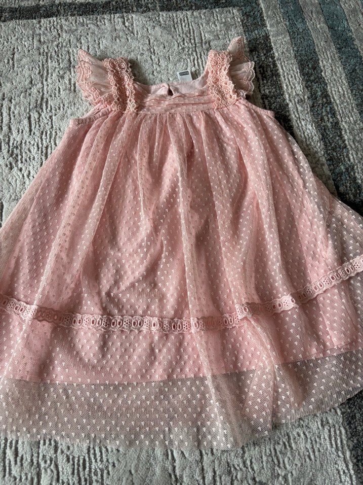 Pudra pembe renkte, fırfırlı ve nakışlı desenlere sahip kız çocuk elbisesi. Yumuşak örme kumaştan, bol kesim ve askısız yakalı, bohem tarzda, kolsuz model.