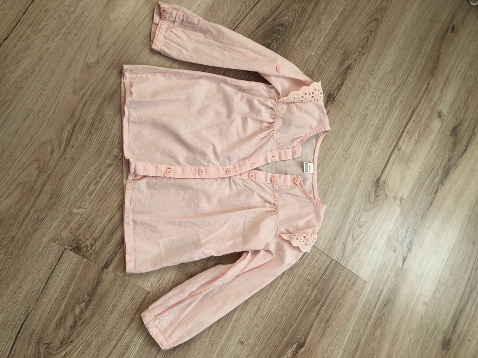 Kız çocukları için pudra pembe, keten kumaştan yapılmış, uzun kollu, düğmeli, V yakalı ve salaş kesim gömlek. Omuzlarda zarif delikli detaylar bulunur.