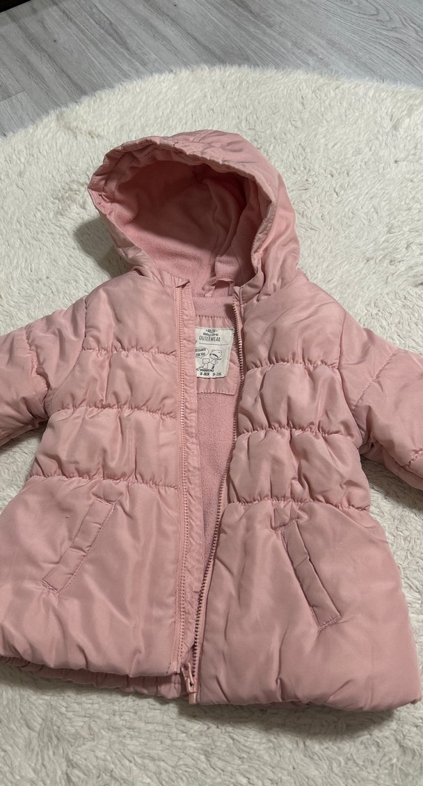 Pudra pembesi renkte, kürk detaylı ve kapüşonlu kız çocuk montudur. Yumuşak ve sıcak tutan fleece astarlıdır.