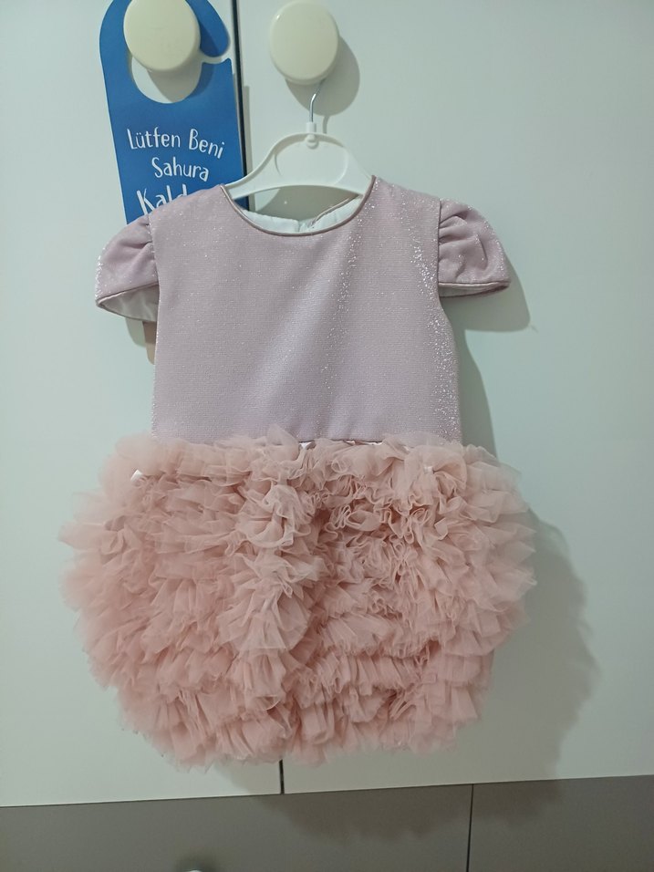 Kısa kollu, yuvarlak yaka ve fırfırlı detaylara sahip, pudra rengi kız çocuk elbisesi. Yumuşak sentetik kumaştan, katmanlı fırfır etekli ve baskılı desene sahip. Sadece 1 Saat Kullanıldı.