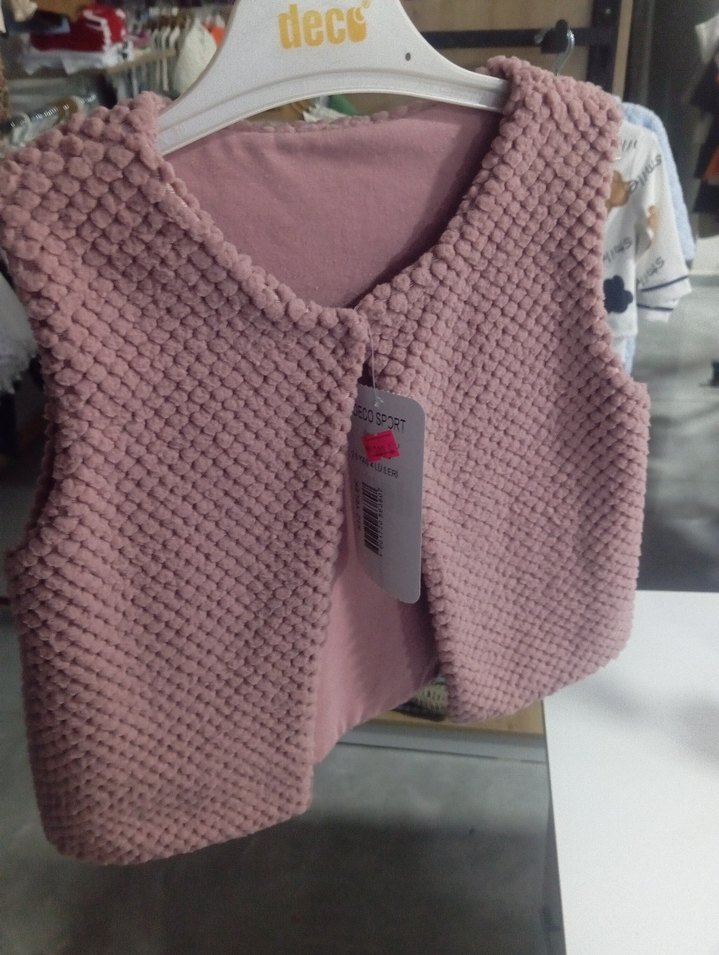 Kız çocukları için, yuvarlak yaka ve kolsuz, pudra renkli, örgü kumaştan yapılmış, vücuda oturan yelek. 1 2 3 4 yaşlara uygundur