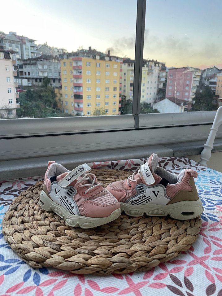 Pudra renkli, baskılı desenli kız çocuk spor ayakkabısı. Kauçuk tabanlı ve kolay giyilen Velcro bantlıdır. Sokak modasına uygun.