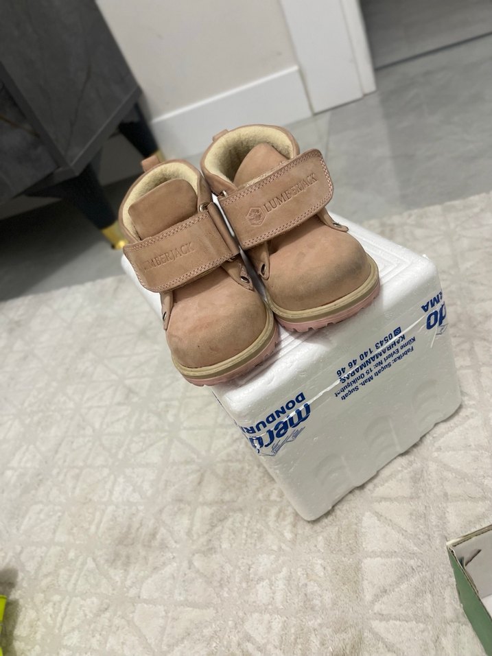 Bej süet malzemeden yapılmış, cırt cırtlı, rahat ve sade tarzda kız çocuk ilk adım ayakkabısı.