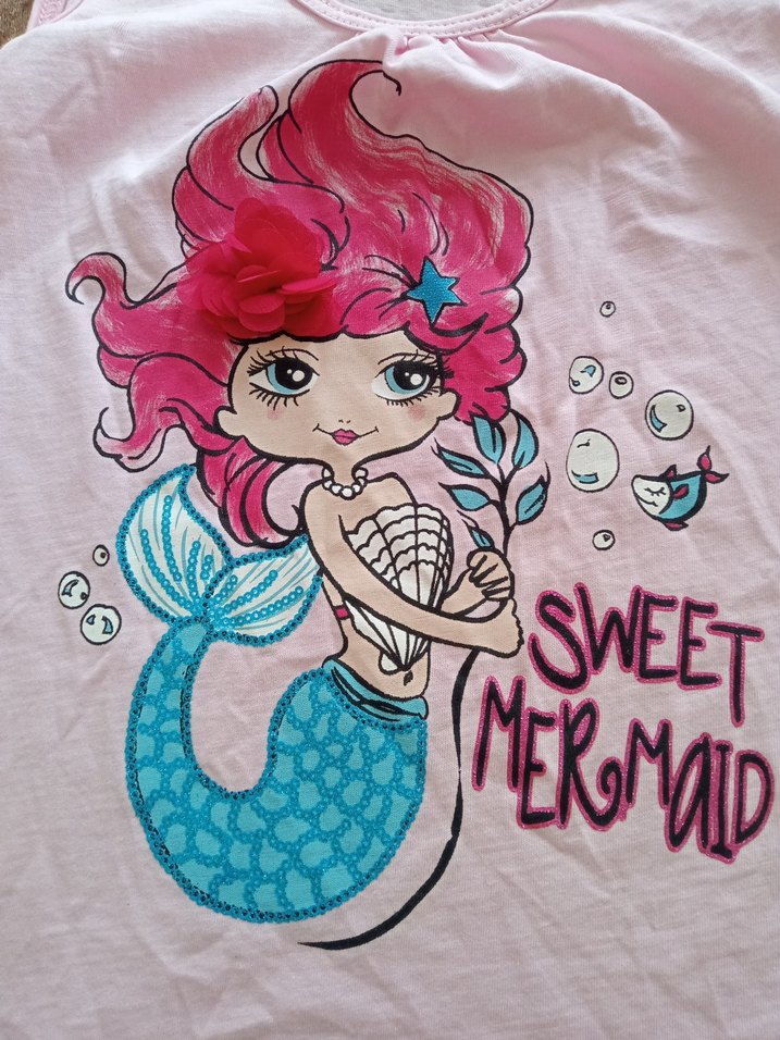 Pamuklu, pembe, pullu baskılı denizkızı figürlü, straplez yaka, kısa kollu, fitted kesim kız çocuk elbise modelleri adet fiyatı toplu alımda indirim yapılır