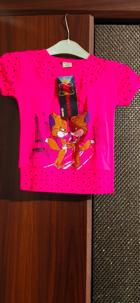 Pembe renkli, kısa kollu ve yuvarlak yaka kız çocuk tişörtü. Yumuşak sentetik kumaştan, renkli baskı ve pullu detaylara sahip, trend sokak stili için uygundur. sifir etiketli
