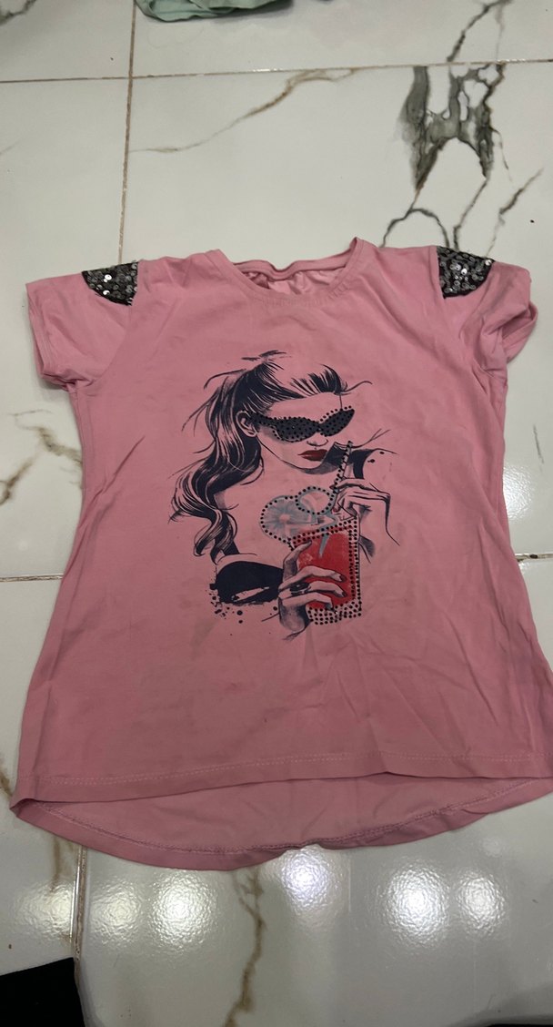 Pembe renkli, baskılı ve kollarda pul detaylı, kısa kollu ve v yaka kız çocuk tişörtü. Sentetik kumaştan, trend sokak stili için uygun. (çoğu çok iyi durumda fiyat tamamıdır)