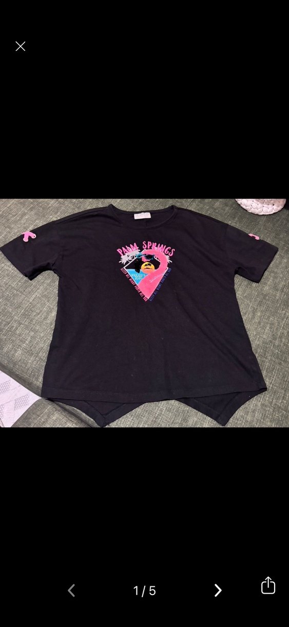 Kısa kollu, yuvarlak yakalı, pul işlemeli renkli baskıya sahip, salaş kesim siyah kız çocuk tişörtü.