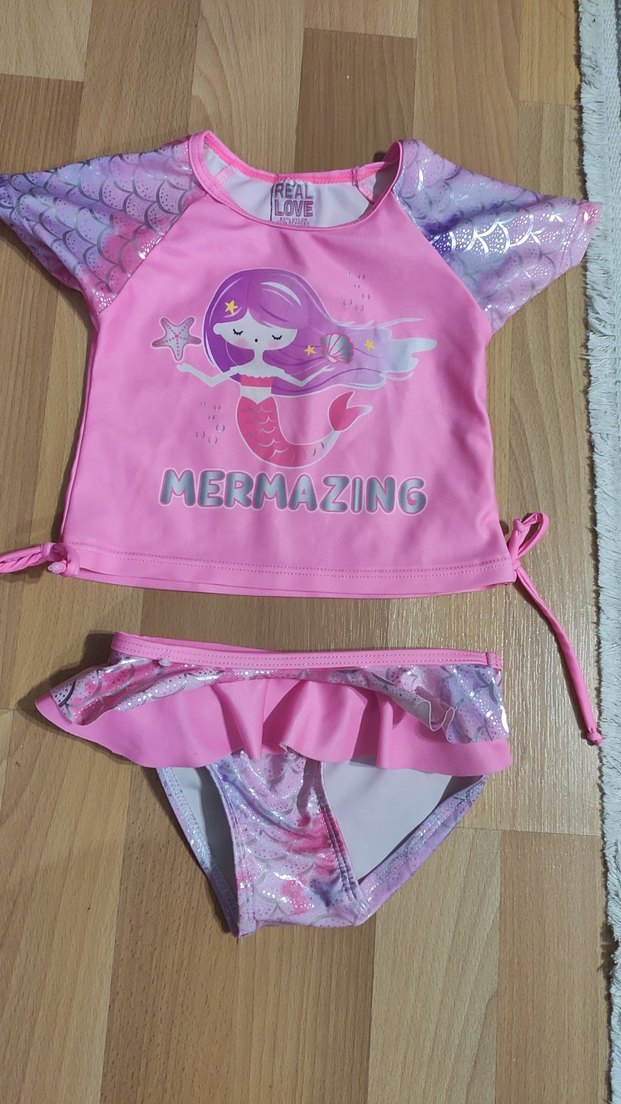 Renkli pembe bikini takımı, parlak kolları ve 'MERMAZING' yazılı deniz kızı baskısı ile plaj için uygundur. ♀️ Amerika'dan geldi hiç giyemedi mevsim uymadığı için