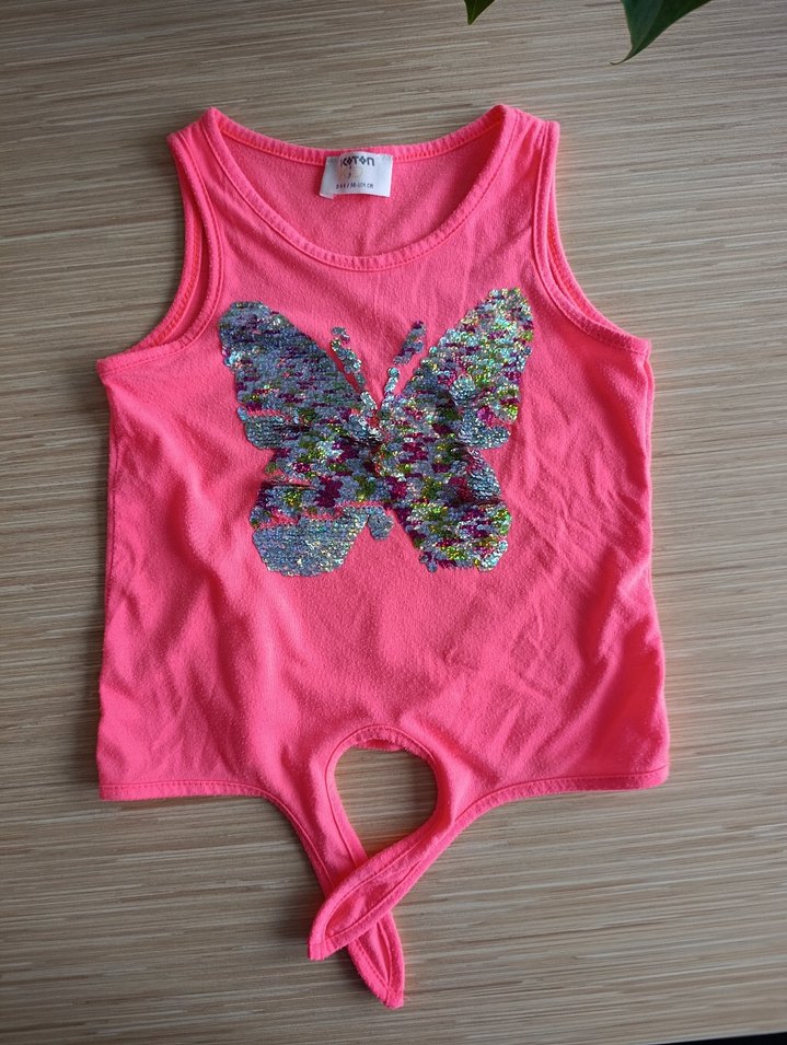 Pembe sentetik kumaştan, pul işlemeli renkli kelebek desenli, fitted kesim kız çocuk askısız atlet.