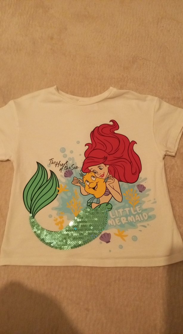 Kız çocukları için kısa kollu, yuvarlak yakalı, pul detaylı Küçük Denizkızı baskılı tişört. Pastel beyaz yumuşak sentetik kumaştan üretilmiştir. ✨bir kere kullanıldı 5/6 yaş #lcwaikiki #tişört #kızçocuk