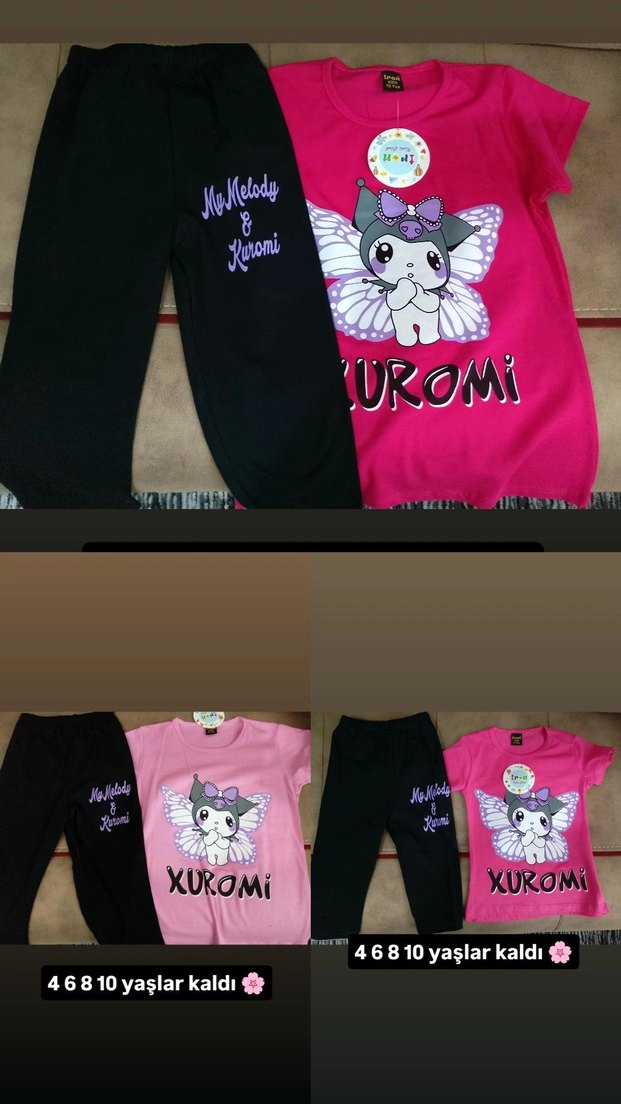 Pembe kısa kollu, pullu Kuromi baskılı üst ve siyah dar kesim eşofman altından oluşan, pamuklu kumaştan yapılmış kız çocuk eşofman takımı. Yuvarlak yakalıdır.