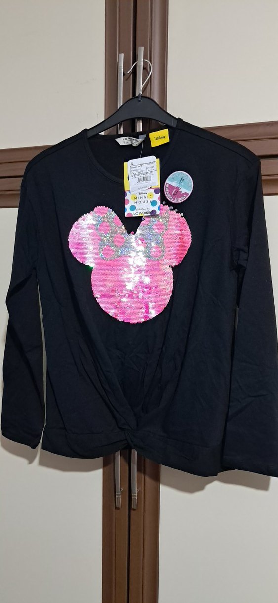Kız çocukları için uzun kollu, bol kesim tişört. Sentetik kumaştan üretilmiş, koyu zemin üzerinde pembe pullu Minnie Mouse baskısı bulunur.