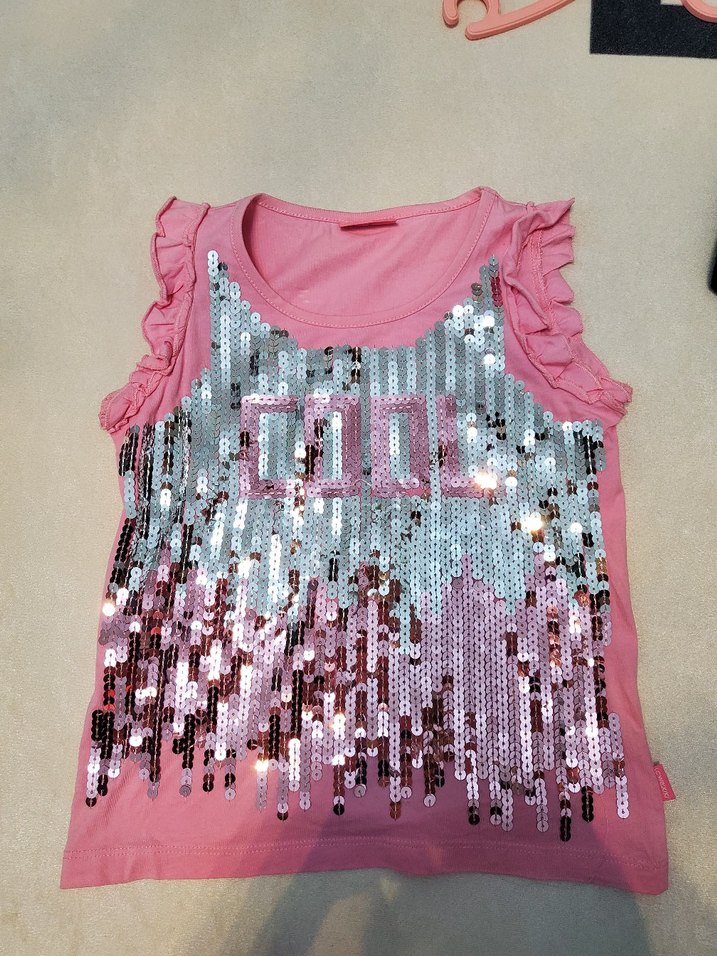 Pembe renkli, kolsuz kız çocuk tişörtü, renkli pullarla COOL baskılıdır ve fırfırlı kollara sahiptir.