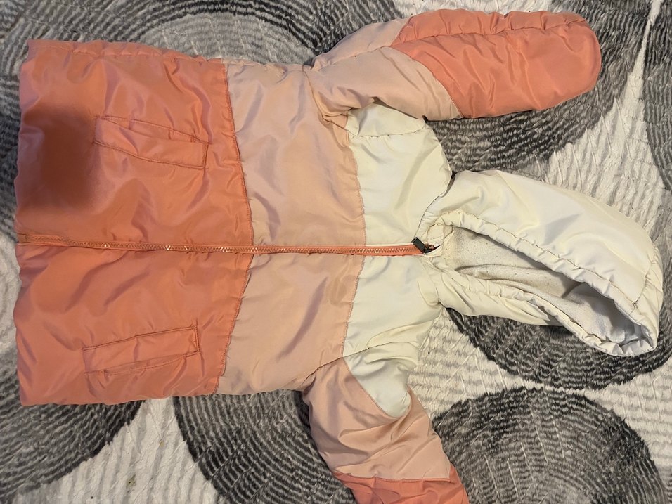Kız çocukları için kapüşonlu, kürk detaylı, sentetik kumaştan yapılmış renk bloklu mont. Fermuarlı, bej, pembe ve şeftali tonlarında 7-8 yaş