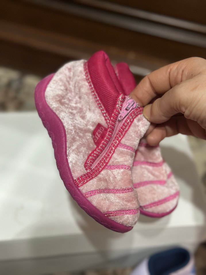 Kız çocukları için pembe, renkli tie-dye desenli ve fermuarlı sıcak panduf. Rahat ve trend sokak stili ayakkabı.