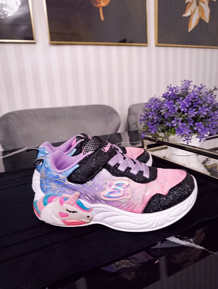 Renkli bağcıklı kız çocuk spor ayakkabısı, pembe ve siyah tonlarda batik desenli, kaymaz kauçuk tabanlıdır. Velcro bantlı, unicorn detaylıdır. 28 numara ışıkları yanmıyor