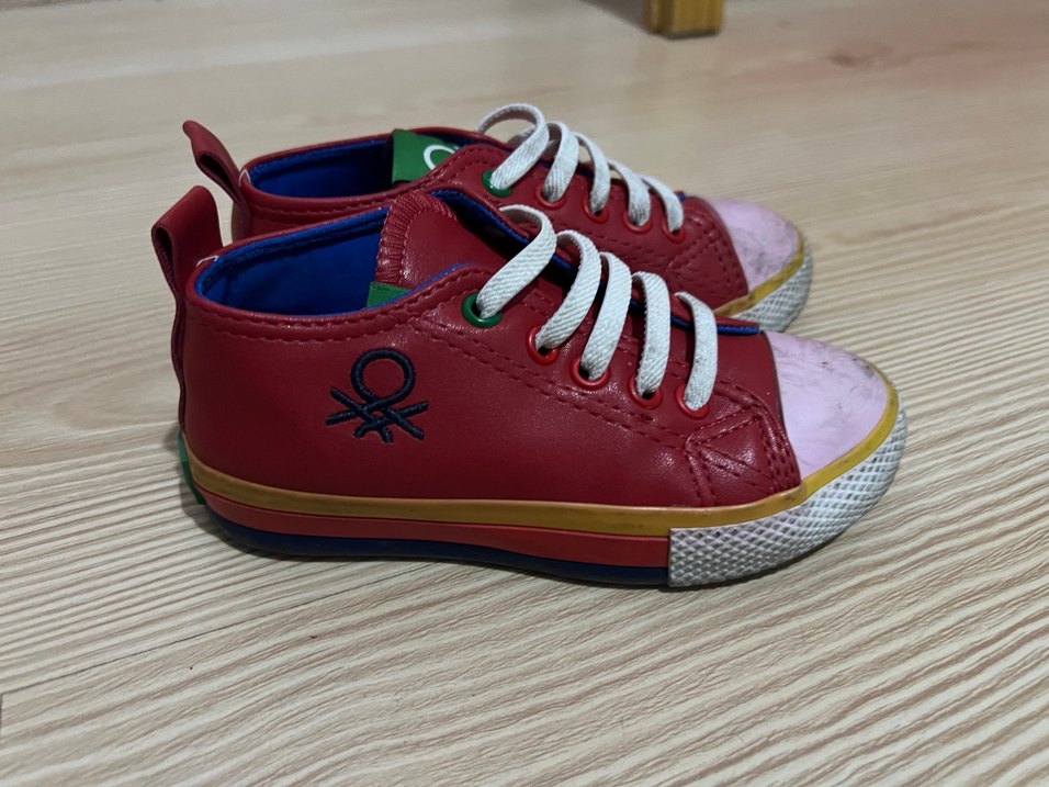 Kız çocukları için renkli tie-dye desenli, kırmızı kauçuk malzemeden yapılmış, beyaz bağcıklı spor ayakkabılar. Streetwear tarzında, kolay kullanım için cırt cırtlıdır.