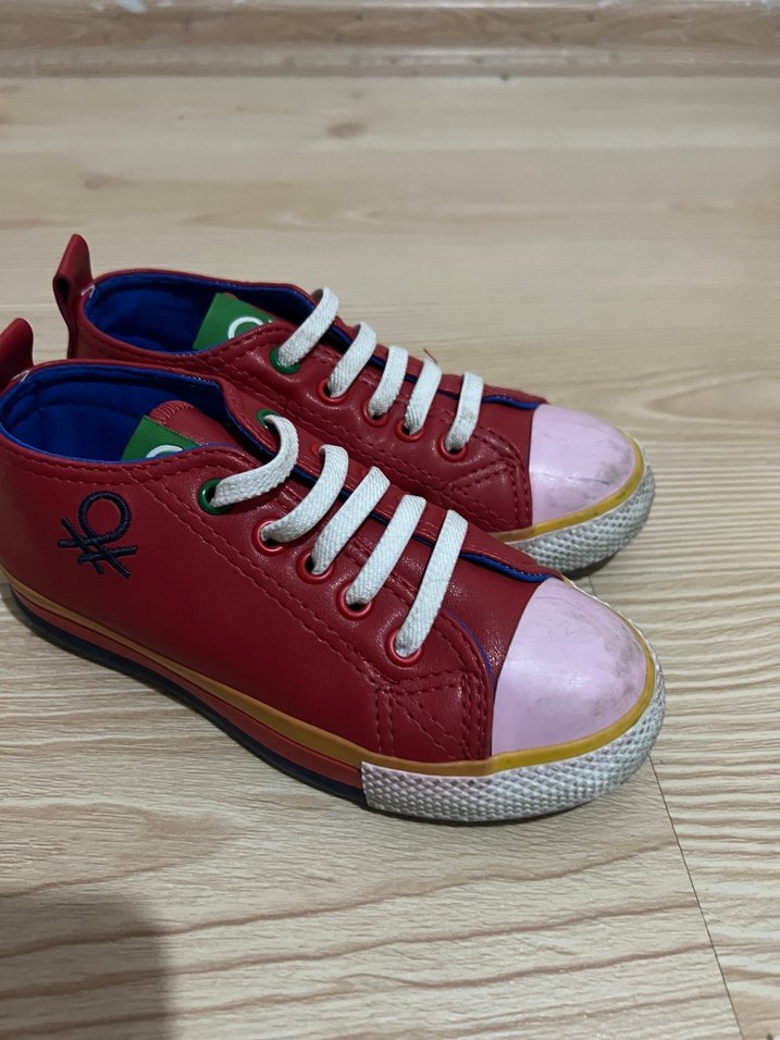 Kız çocuk spor ayakkabısı, renkli tie-dye desenli, kırmızı kauçuk gövde ve pembe burun kapaklıdır. Beyaz bağcık ve kolay giyilen