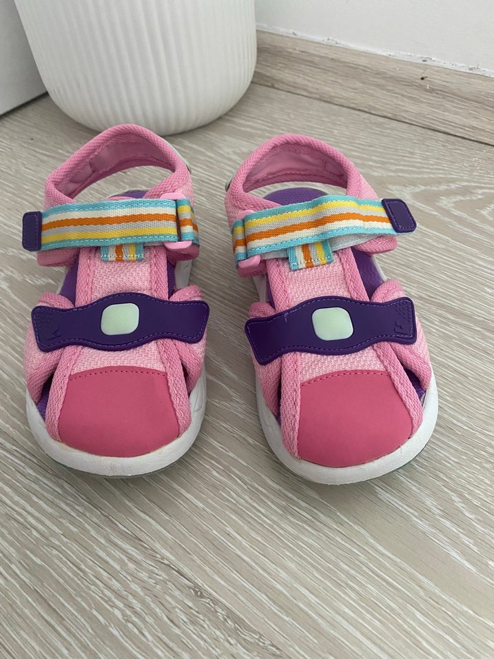 Kız çocukları için renkli bağcıksız terlik. Pembe ve mor detaylarla bağcıksız, ayarlanabilir cırt cırtlı bantlar ve kauçuk taban içerir.