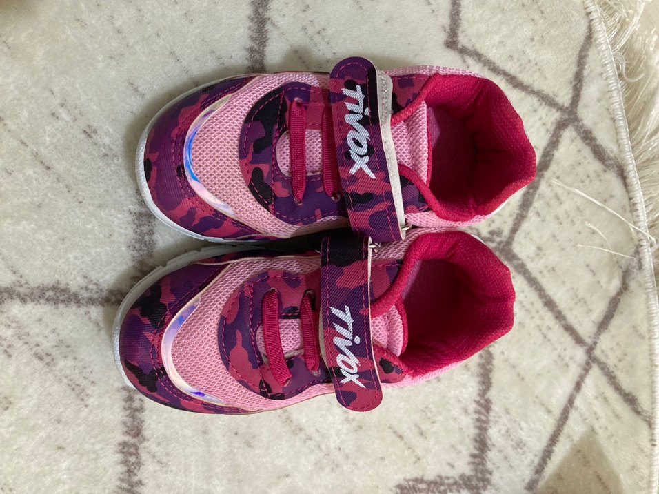 Renkli tie-dye desenli, pembe kız çocuk spor ayakkabısı. Kaymaz kauçuk taban ve TiVOX yazılı cırt cırtlı bant içerir. İki kere giyildi yeniden farksız.