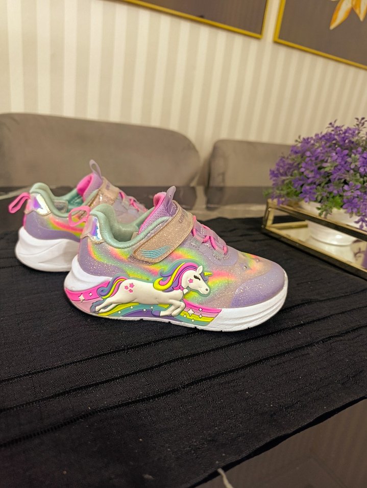 Renkli bağcıksız kız çocuk spor ayakkabısı, tie-dye deseni ve yan tarafında unicorn figürü bulunur. Kauçuk tabanlı ve kolay kullanım için cırt cırtlıdır. 24 numara Genel olarak tertemizdir ışıkları yanıyor
