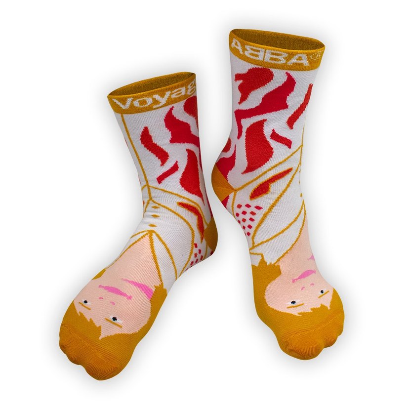Sarı tonlarda, yumuşak ve sıcak tüylü kumaştan yapılmış kız çocukları için renkli bağlama desenli çorap. ABA yazısı bulunur.