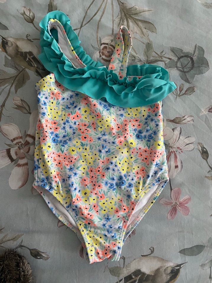 Renkli bağlama desenli kız çocuk mayosu, turkuaz fırfırlı yaka ve kolsuz tasarıma sahiptir, plaj için uygundur. 1 kez 5 günlük tatilde kullanıldı yepyeni 2 yaştan itibaren uygun olacaktır