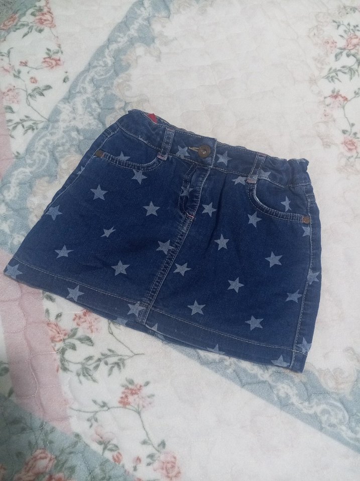 Kız çocukları için renkli bağlamalı yıldız desenli, düğmeli ön cep detaylı, fitted kesim denim etek.