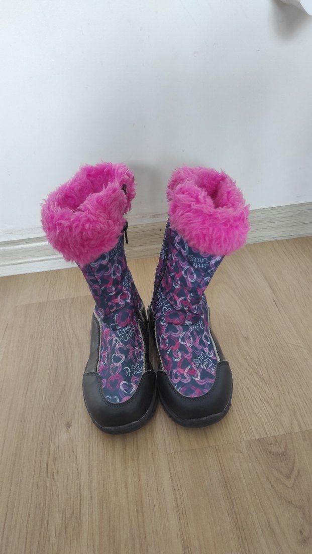 Kız çocukları için renkli bağlamalı desenli, üst kısmı pembe kürklü bot. Yumuşak ve sıcak kumaşla rahatlık sağlar.
