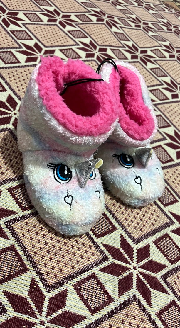 Kız çocukları için renkli bağlamalı peluş ev terlikleri, yumuşak ve sıcak kumaş, kürklü detaylar ve eğlenceli unicorn desenine sahip.