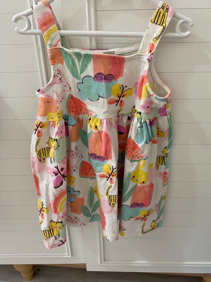 Rahat kesim, askılı ve renkli baskılı elbise, fırfır detaylı ve straplez yakalı, bohem tarzını yansıtır.