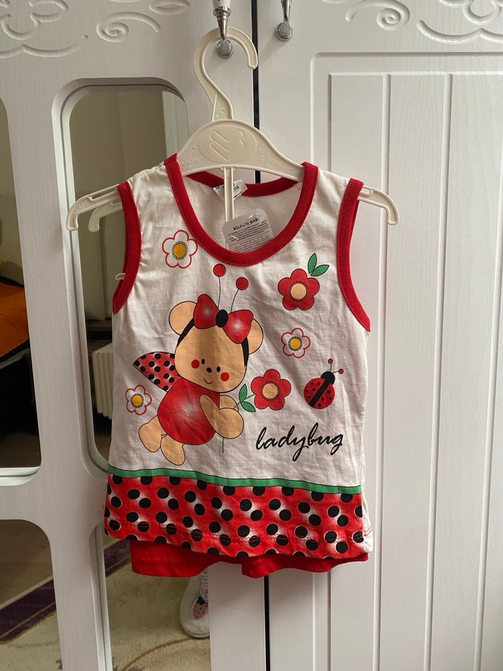 Kırmızı-beyaz renklerde, uğur böceği ve çiçek baskılı şort ve sıfır kollu atlet