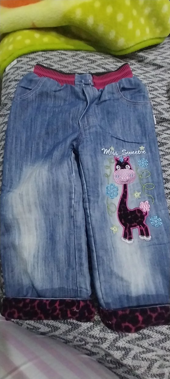 Kız çocukları için bol kesim, renkli baskılı zürafa desenli, kemerli mavi kot pantolon. Rahat sokak stili için uygundur.