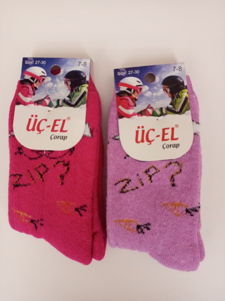 Yumuşak, sıcak kumaştan yapılmış, havlu renkli baskılı kız çocuk çorapları 27-30 numara. Pembe ve mor tonlarında, eğlenceli desenli. 2'adet fiyatı