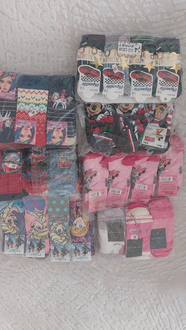 Yumuşak tekstil malzemeden yapılmış, çeşitli baskılı desenlere sahip renkli kız çocuk çorapları. Her pakette farklı desenlerde birden fazla çift bulunur. soket çorap 50tl külotlu çorap 150 tl