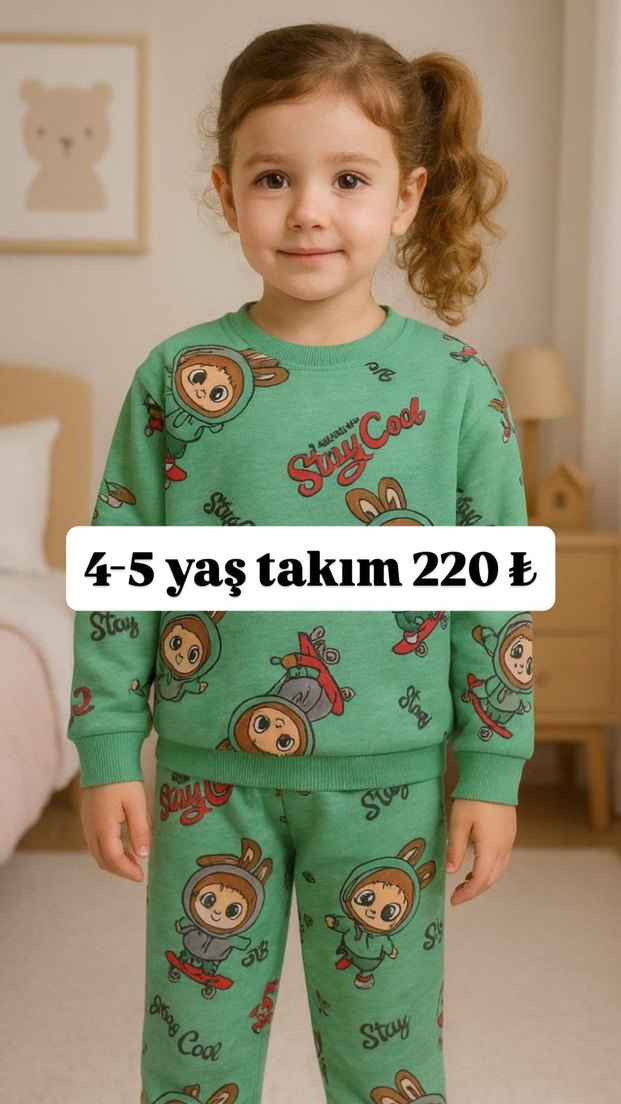 Kız çocukları için renkli baskılı, , uzun kollu ve bol kesim yeşil eşofman takımı. Street wear tarzında, 4-5 yaş için uygun.