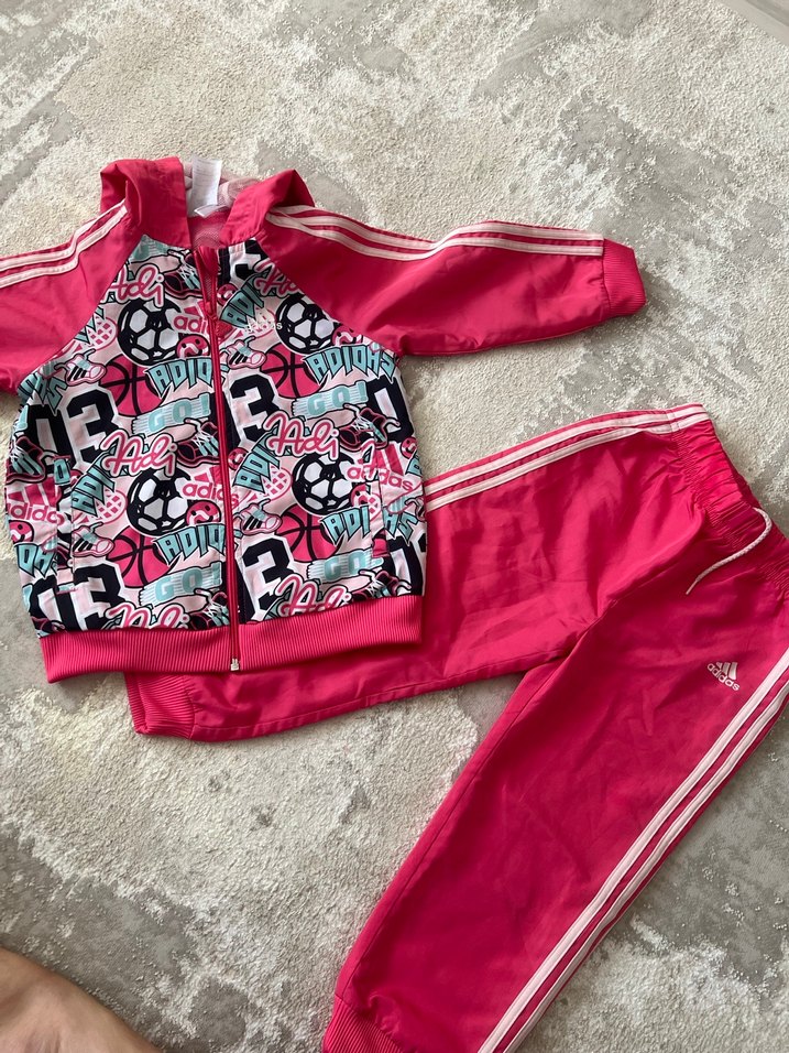 Renkli baskılı, kapüşonlu ve fermuarlı polar kumaştan yapılmış dar kesim kız çocuk eşofman takımı, çizgili pembe pantolonla birlikte 2.3 yaş ama 4 yaşa kadar oluyor