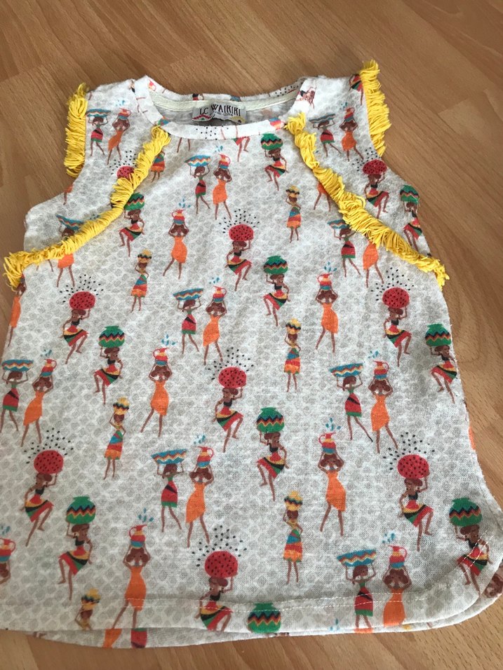 Kolsuz, salaş kesim kız çocuk bluzunda yuvarlak yaka ve renkli baskılar bulunur. Sarı fırfır detaylarıyla bohem tarzı yansıtılır. Kumaşı yumuşak ve gri zeminlidir.