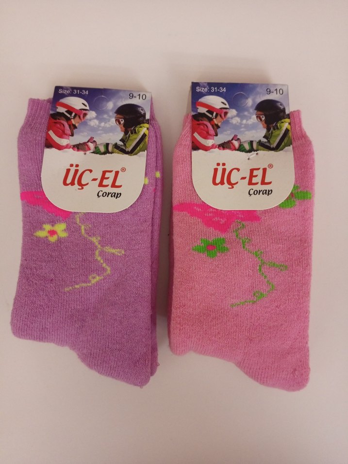 Renkli baskılı desenlere sahip, yumuşak ve sıcak tutan havlu kumaştan kız çocuk çorapları. 31-34 numara, rahat kullanım sağlar.