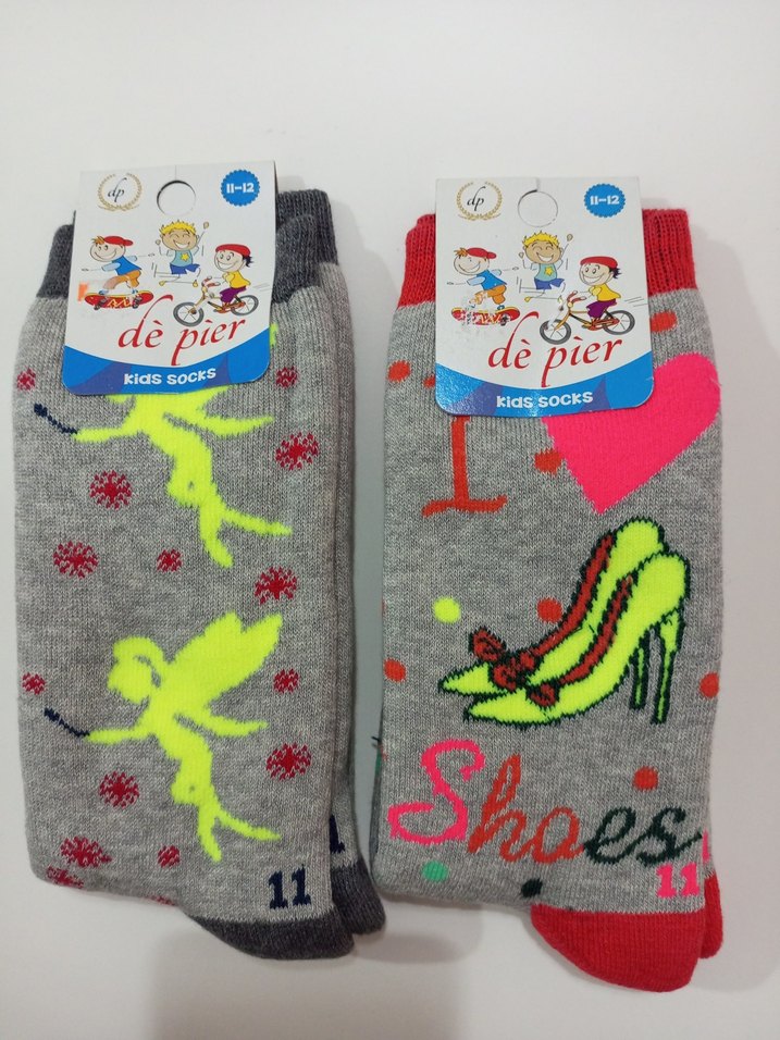 Yumuşak ve sıcak havlu kumaştan, periler ve topuklu ayakkabı baskılı renkli kız çocuk çorapları. 11-12 yaş