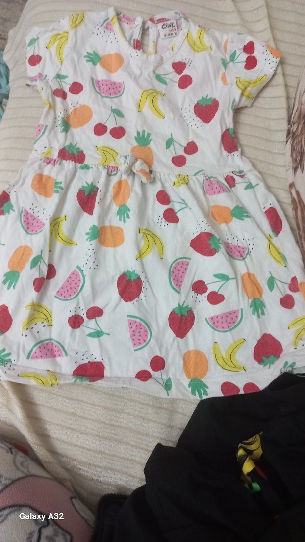 Renkli meyve desenli, yumuşak sentetik kumaştan kız çocuk elbisesi. Kısa kollu, straplez yakalı ve bol kesim, fırfır detaylı, günlük sokak stiline uygun.