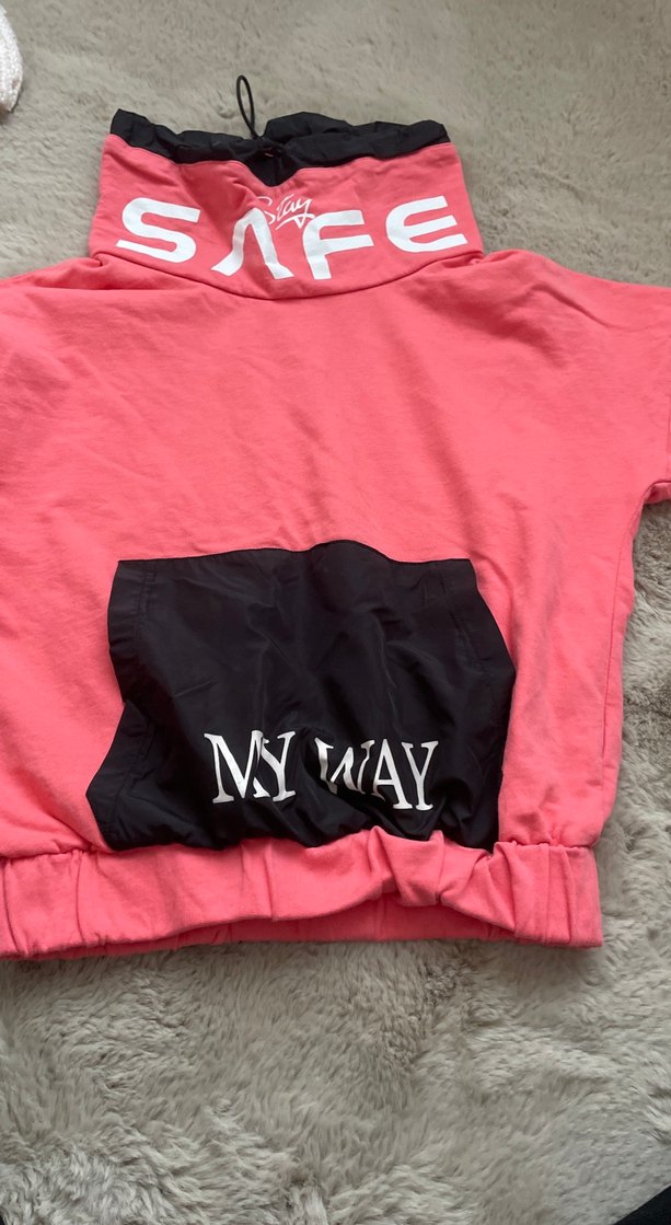 Rahat kesim pembe sweatshirt, kısa kollu ve bisiklet yaka. Canlı renkli baskılar ve fermuarlı siyah cepli detay bulunur. "SAFE" ve "MY WAY" yazılıdır.