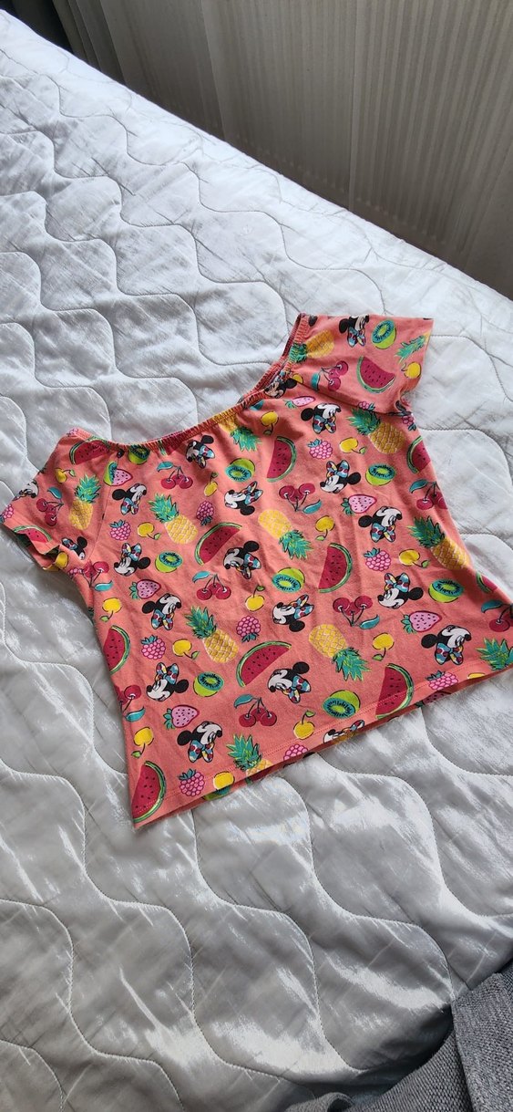 Rahat kesim, bisiklet yaka kısa kollu kız çocuk tişörtü, yumuşak sentetik kumaş üzerine renkli pop kültür baskıları ve düğme detaylı.
