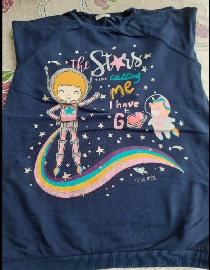 Kısa kollu, yuvarlak yakalı kız çocuk tişörtü, yumuşak sentetik kumaştan. Renkli baskı ve simli detaylarla süslenmiş, uzay temalı eğlenceli desenler içerir. Yumuşak sentetik kumaştan, simli renkli baskılı, uzun kollu ve bisiklet yakalı kız çocuk tişörtü, rahat ve trend görünümlü. LCW markalı, 10-11 yaş aralığı. (sadece üst kıyafet) Lacivert renkli, az kullanılmıştır. Küçüldüğü için satılıktır.